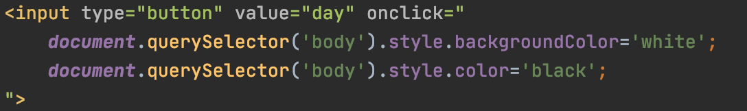 위처럼 document.querySelector를 이용하는 것인데, body라는 태그 선택자를 지정할 것이므로 'body'이다. 만약 id값이 있는 태그를 선택하려면 '# ~' , class값이 있는 태그를 선택하려면 '. ~'으로 지정할 수 있다. style속성 값을 변경하기 위해선 위와 같은 형태로 작성해주면 되는데, 주의할 점은 작은따옴표 안에 값을 넣어주어야 한다는 것이다. (따옴표를 안 넣거나, 큰 따옴표면 에러)