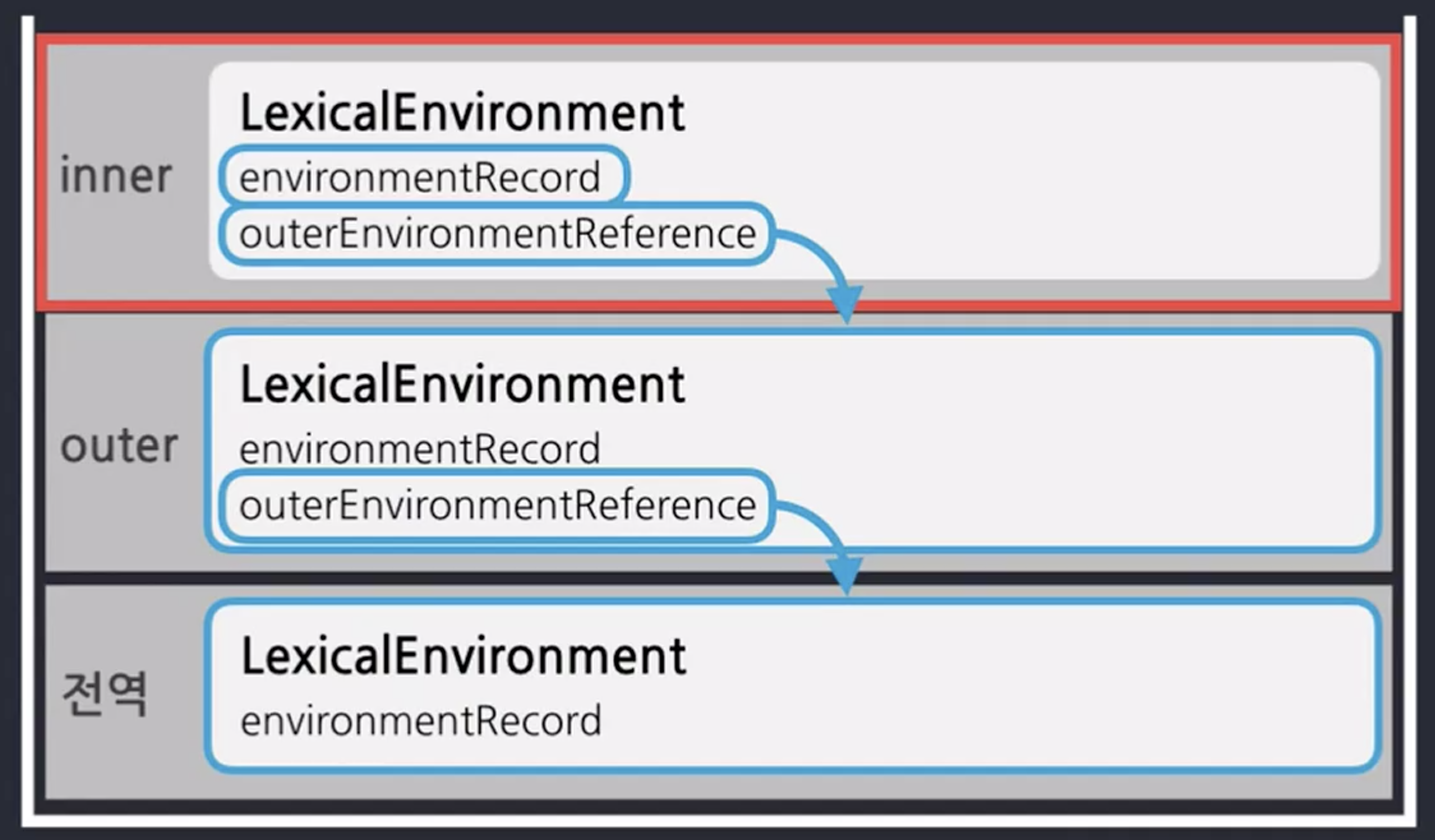 위에서 잠깐 언급한 scope chain이란, inner에서 어떤 식별자를 사용하기 위해서는 먼저 자신의 environmentRecord를 탐색한 후, 존재하지 않으면 outer의 environmentRecord를 탐색하고, 없으면 전역의 environmentRecord를 찾는 일련의 과정이다.