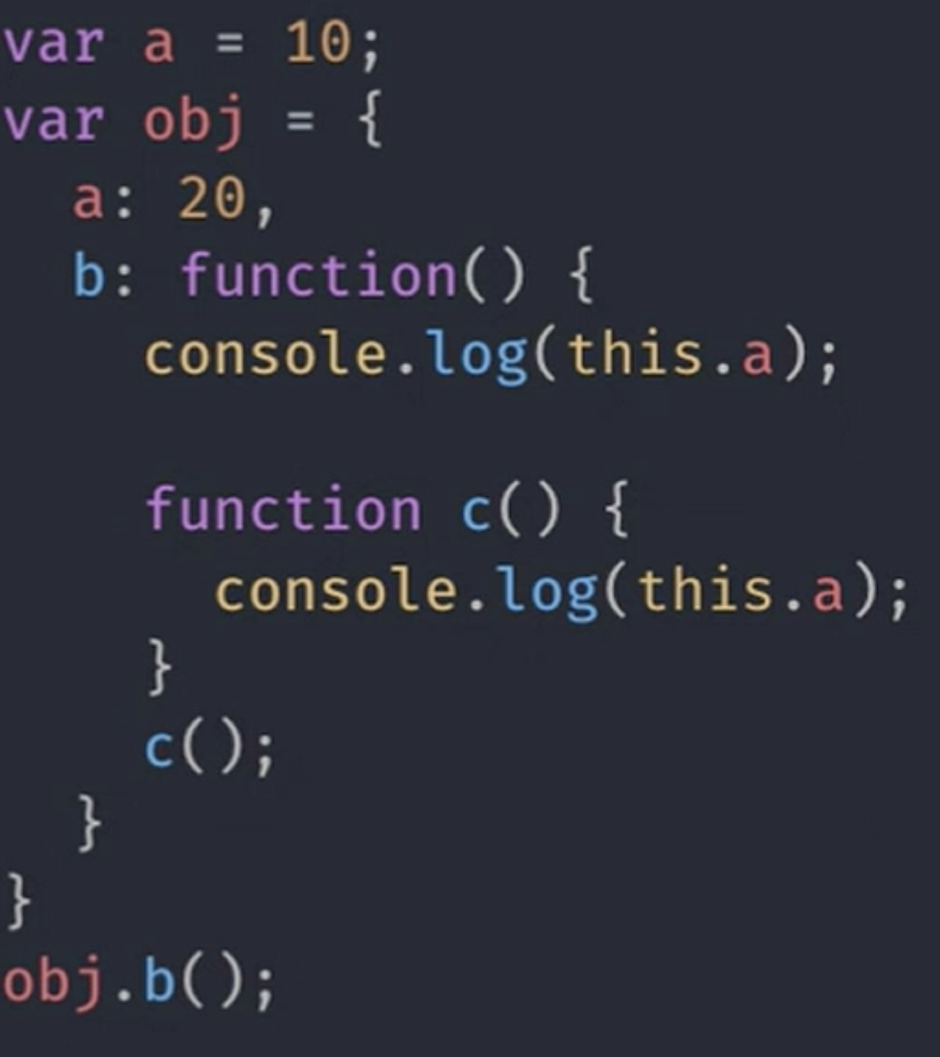 첫 번째 this의 경우 obj.b() 즉, 메서드를 호출하는 방식이다. 그렇다면 이때 this는. 앞의 obj가 되므로, this.a는 obj의 a가 되어 20이 출력이 된다.