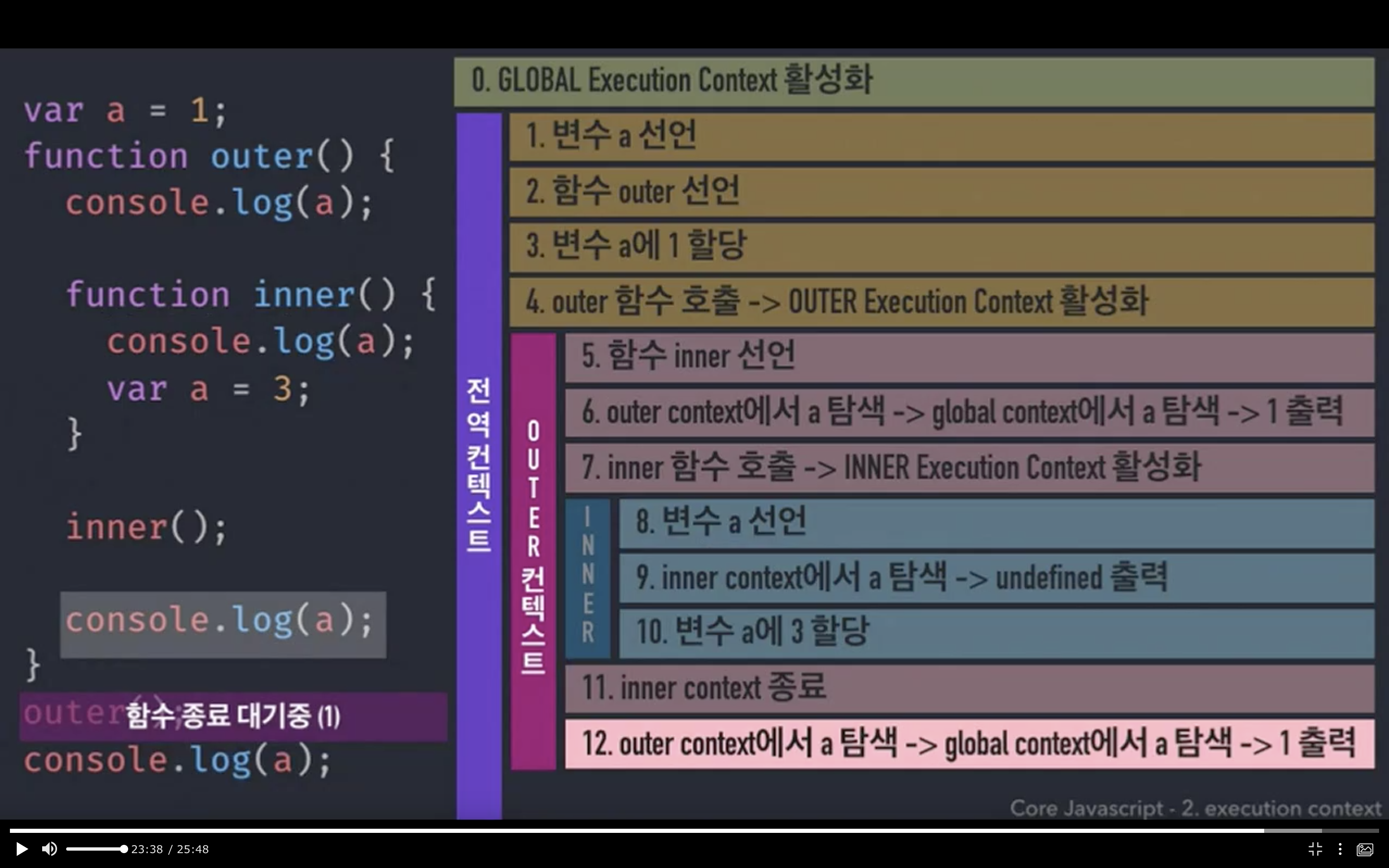 1) 전역 콘텍스트는 js파일이 실행되는 그 순간 콜 스택에 담기게 된다.