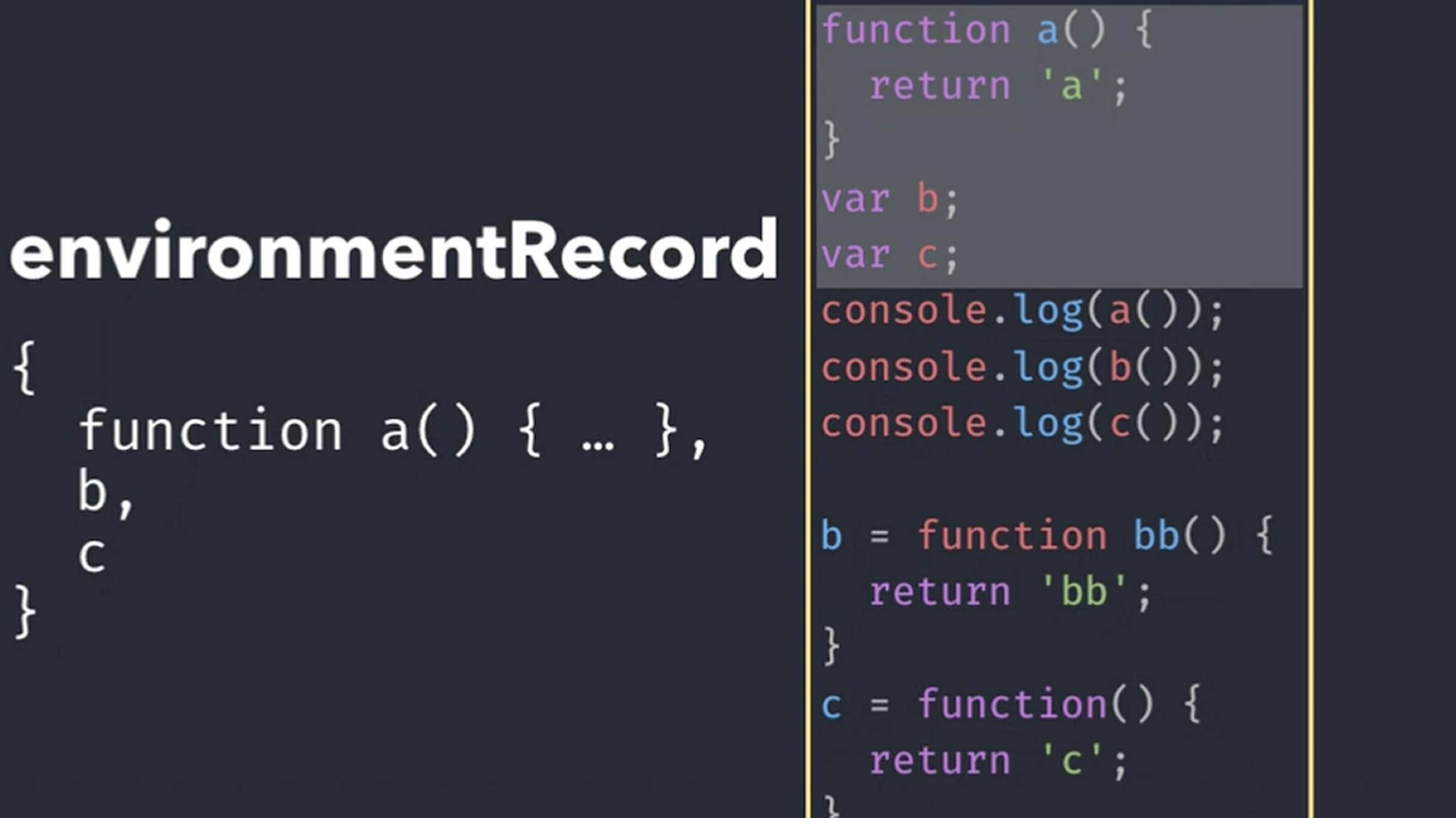 environmentRecord는 우리가 흔히 알고 있던 hoisting을 뜻한다. hoisting으로 알고 있던 개념은 사실 허구의 개념이고, environmentRecord에 데이터를 수집하는 과정이 hoisting현상의 구체적인 동작 과정이라고 볼 수 있다.