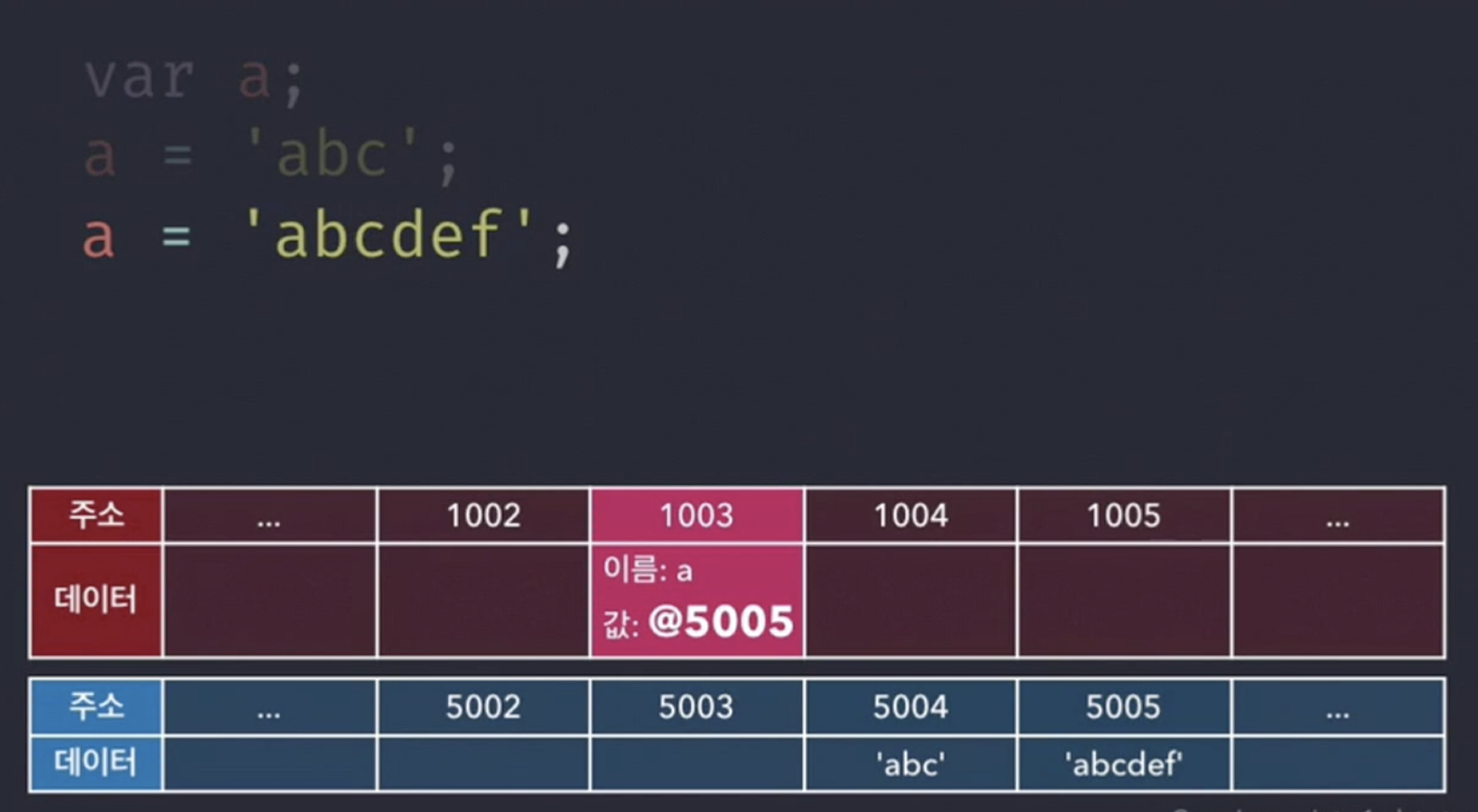 2) a='abc'; 가 이루어지기 위해서, 'abc'라는 값을 5004번 주소에 넣는다.