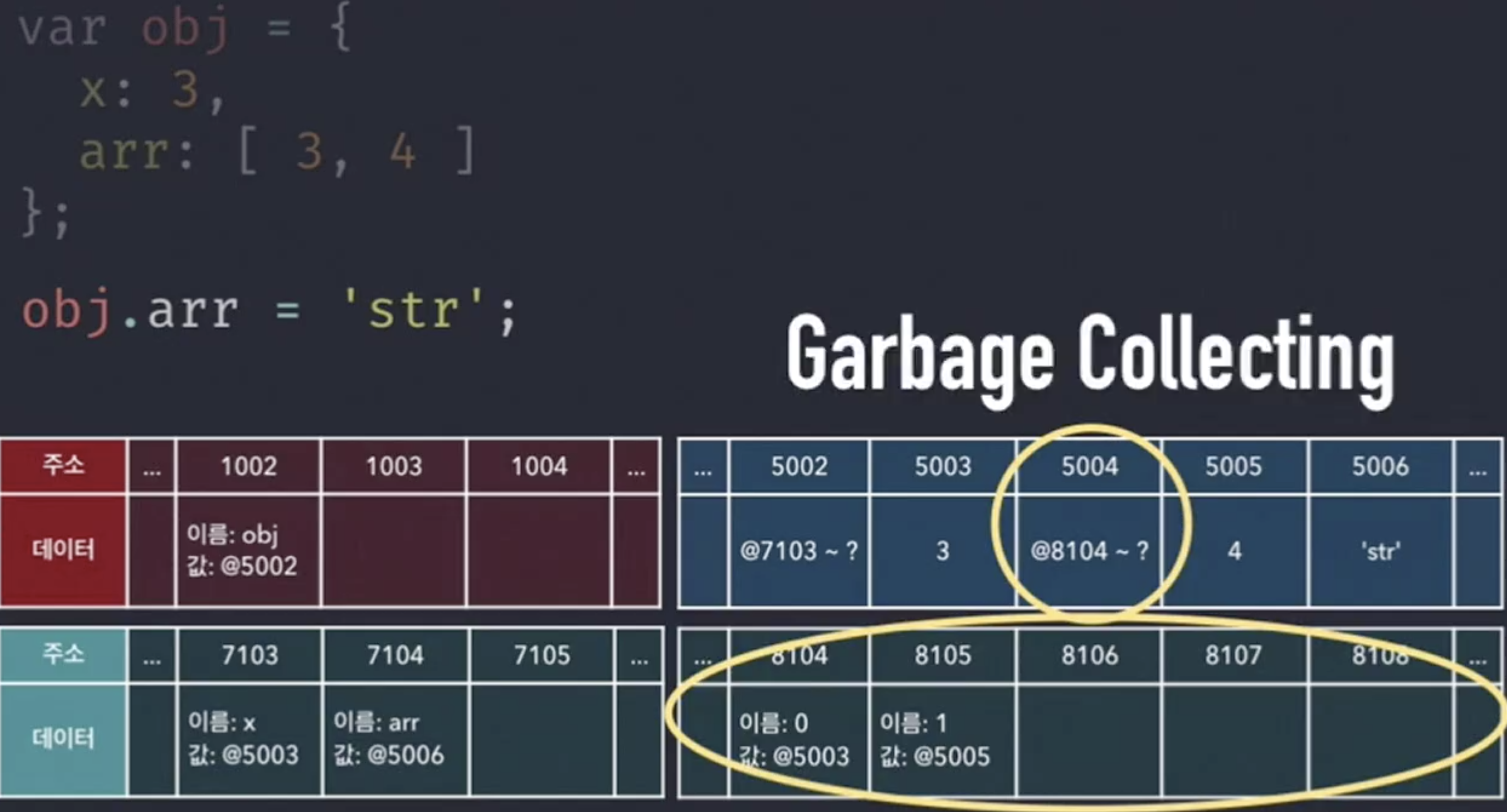 +) primitive변수가 주소에 할당되면 그 값은 계속해서 재사용된다. 즉 , x:3이나 obj.arr [0]은 같은 5003번 주소를 가리키게 된다.