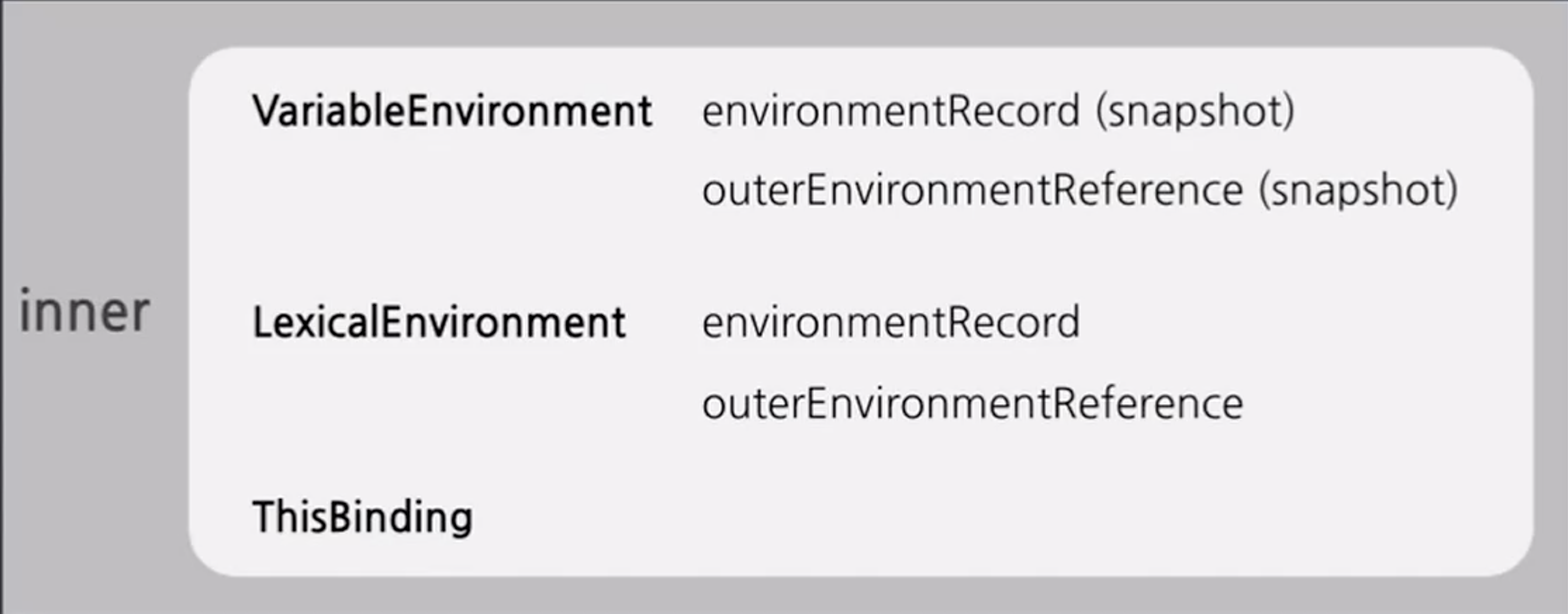 environmentRecord에 호이 스팅 된 데이터가 기록이 되는 곳이라면, outerEnvironmentReference는 해당 콘텍스트에 관련되어있는 외부 컨텍스트에 대한 참조 정보이다. 아래와 같이 outer의 LexicalEnvironment에 대한 정보를 inner의 outerEnvironmentReference를 통해 참조하고 있는 것이다.