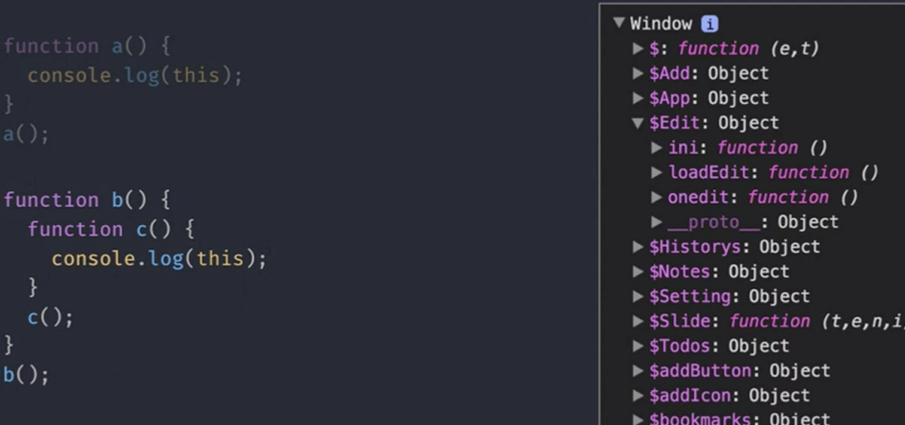 window 즉 전역 객체를 가리킨다...? 이것에 대해 자바스크립트의 실수다 vs 자바스크립트의 하나의 특성으로 받아들여야 한다 라는 의견이 분분하다고 한다. 이러한 문제 때문에 ES6부터는 this바인딩을 하지 않는 arrow function이 나오게 되었다. 즉, arrow function에서는 위와 같은 경우 c의 this가 b가 되는 것이다. 위에서 이해한 것을 그대로 적용할 수 있는 것이다!!!