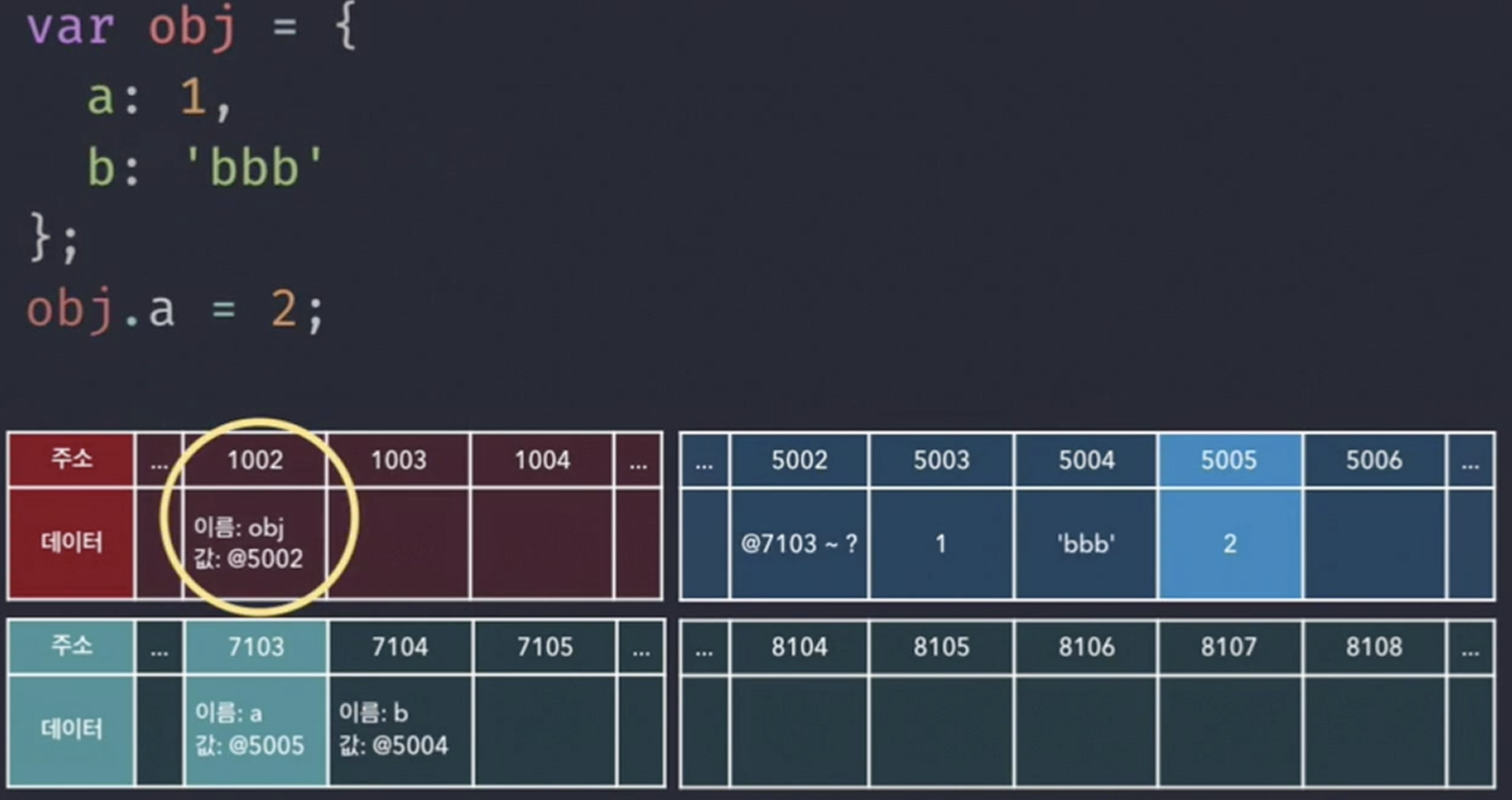 5) obj.a=2;가 실행되는 원리는 obj를 담은 1002번째 주소에 접근 >> 5002번 주소 >> 7103부터 이름이 a인 주소를 찾는다. >> 7103 주소에 접근, 새로운 값이 부여된 주소로 값을 변경 @5003 -> @5005