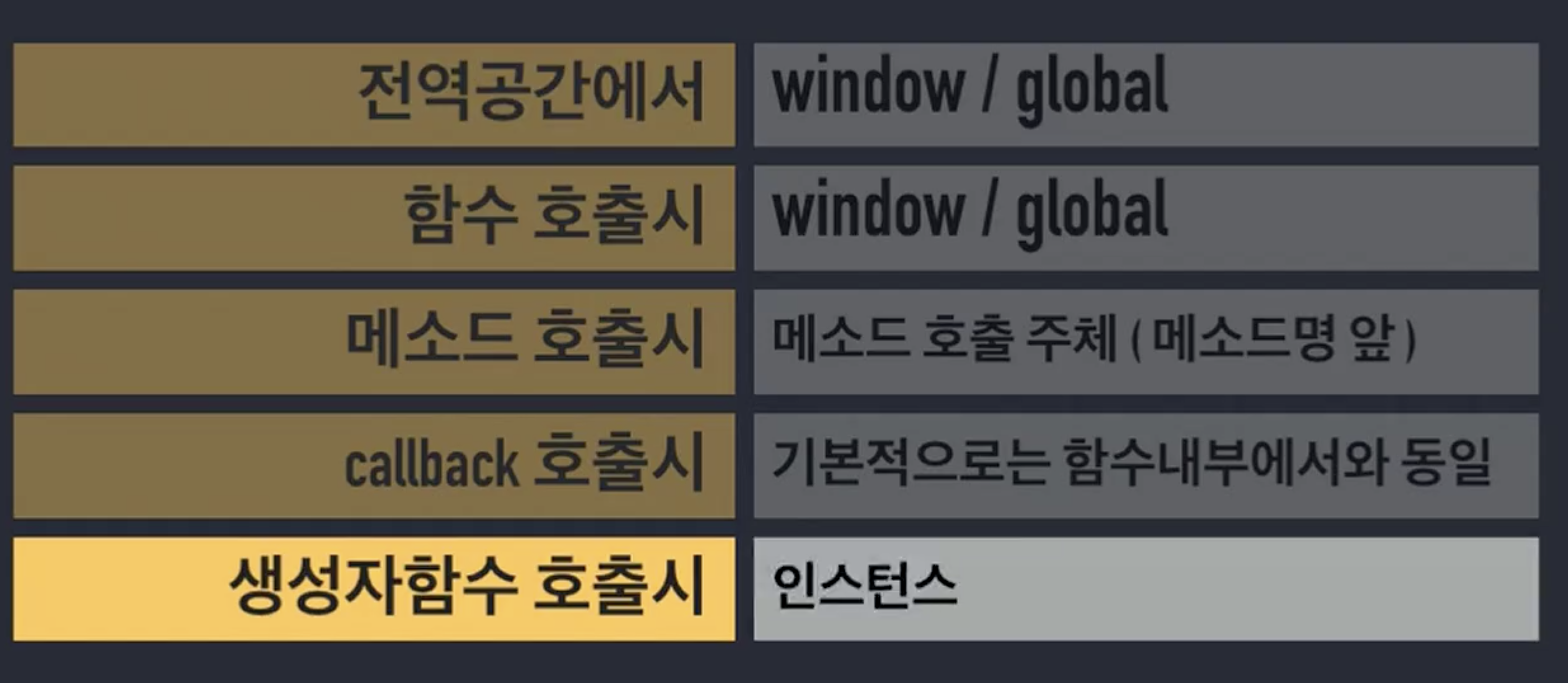+ 위에 것들이 다 헷갈린다면 호출된 형태를 보는 것이 가장 쉽다고 한다. 즉, this가 담긴 콘텍스트를 호출하는 형태가 함수라면 this는 window/global이 된다고 외운다! (함수는 전역 객체의 메서드라고 외운다. 그리고 호출방식이 메소드면 .앞의것이 this가 된다고 외운다.)
