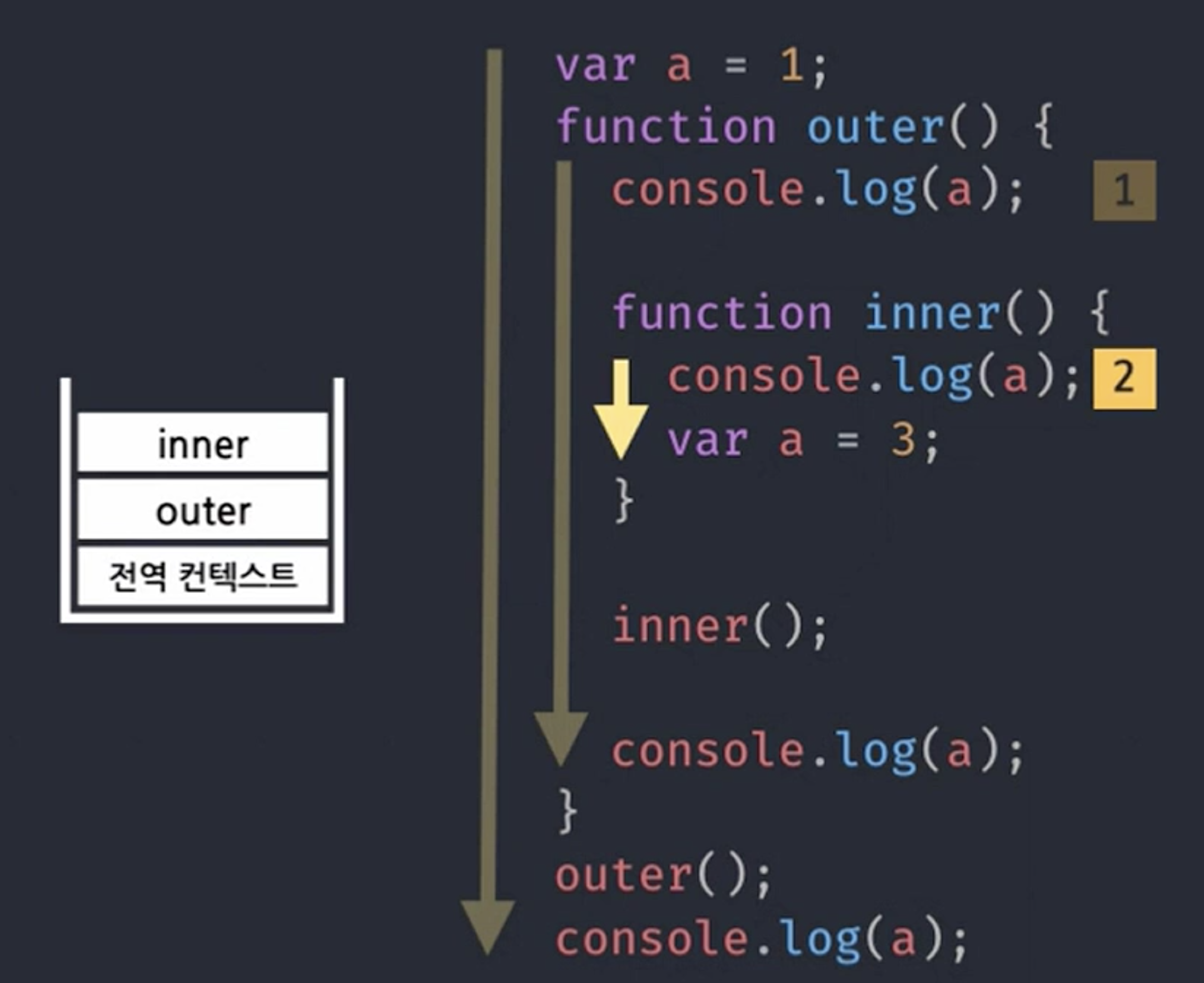 만약, outer와 전역에만 var a가 선언되어있고 각각 2,3으로 할당되어있다면? inner에서 자신의 environmentRecord에 a가 없는 것을 확인하고 다음 참조 콘텍스트인 outer에 가서 a를 탐색하는 것이다! 결과적으로 2,2,3이 출력될 것이다.