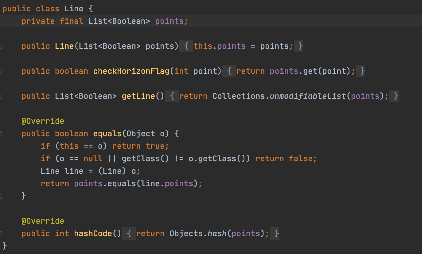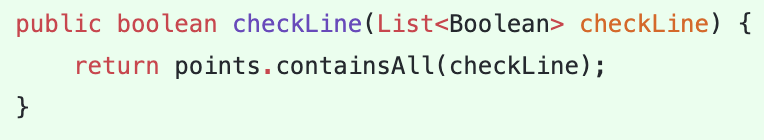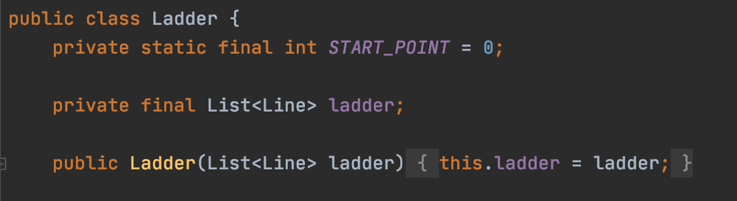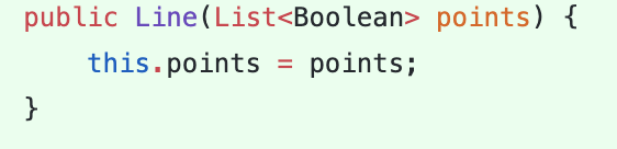 즉, 한줄을 의미하는 List line을 상태값으로 갖는 Line클래스를 정의하고 사다리 전체를 표현할때는 List으로 표현하는 것이다. 이렇게하면 Line정보에 불변성을 부여할 수 있음과 동시에 의미하는 바를 명확히 전달할 수 있는 장점이 있었다.