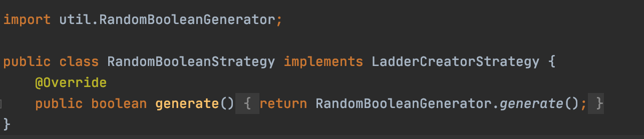 프로덕션 코드에서는 랜덤으로 생성하기 위해 LadderCreatorStrategy를 구현한 클래스를 만들고 사용한다.