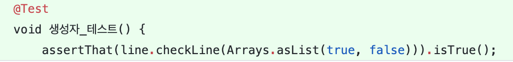 위의 예시와 같이 Line의 생성자에서는 상태를 초기화 해주는 것 외에는 아무런 로직이 없는데, 이것을 테스트 하기 위해서 checkLine이라는 메소드를 만들어서 사용하고 있다. 이 메소드가 다른곳에서도 사용된다면 모르겠지만 오로지 생성자 테스트를 위해 만들어 졌다면 '굳이'라는 느낌이 든다. 따라서, 로직이 없는 생성자를 테스트하는것만이 목적인 불필요한 메소드 생성은 하지 않는것이 좋겠다.
