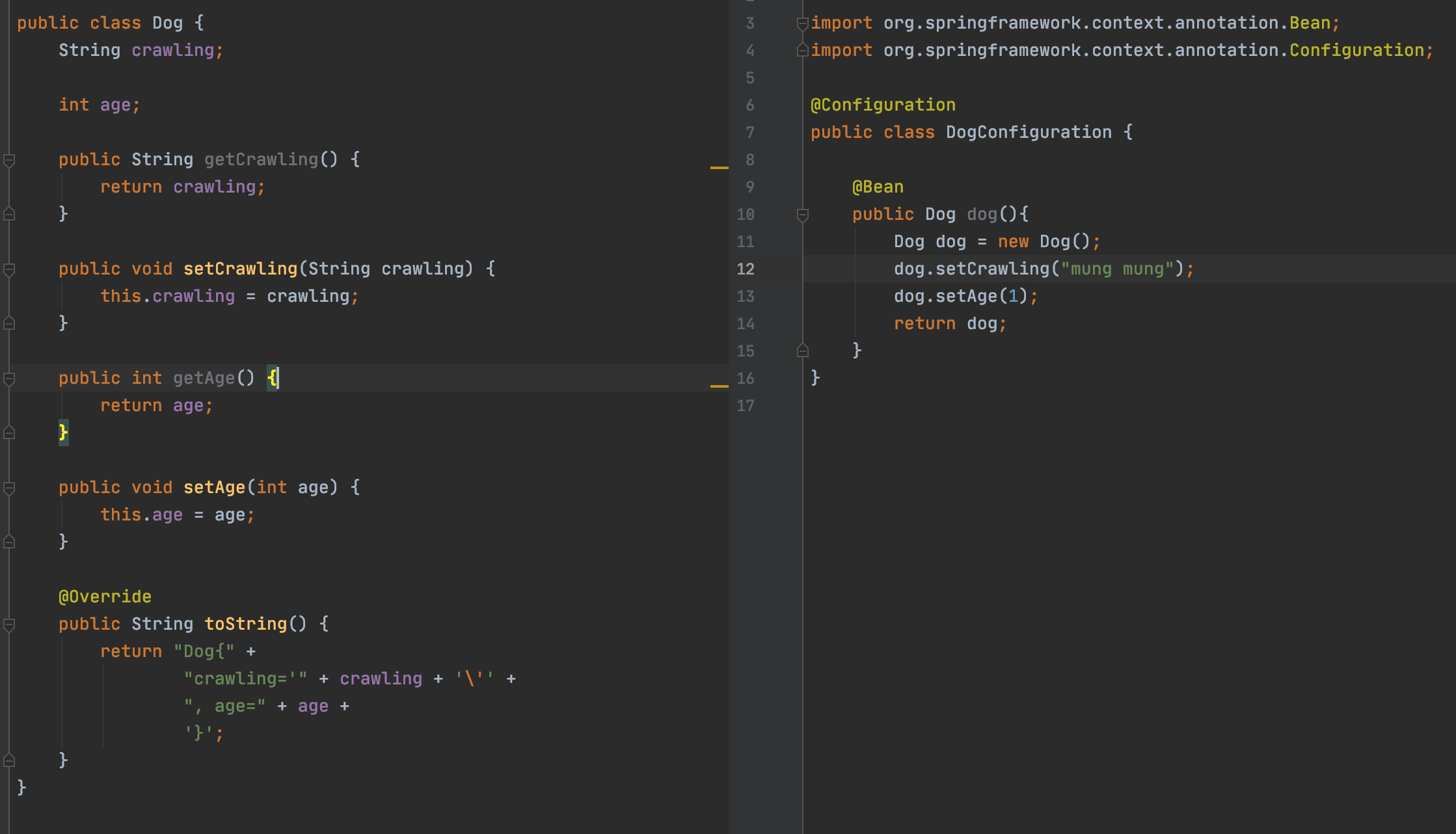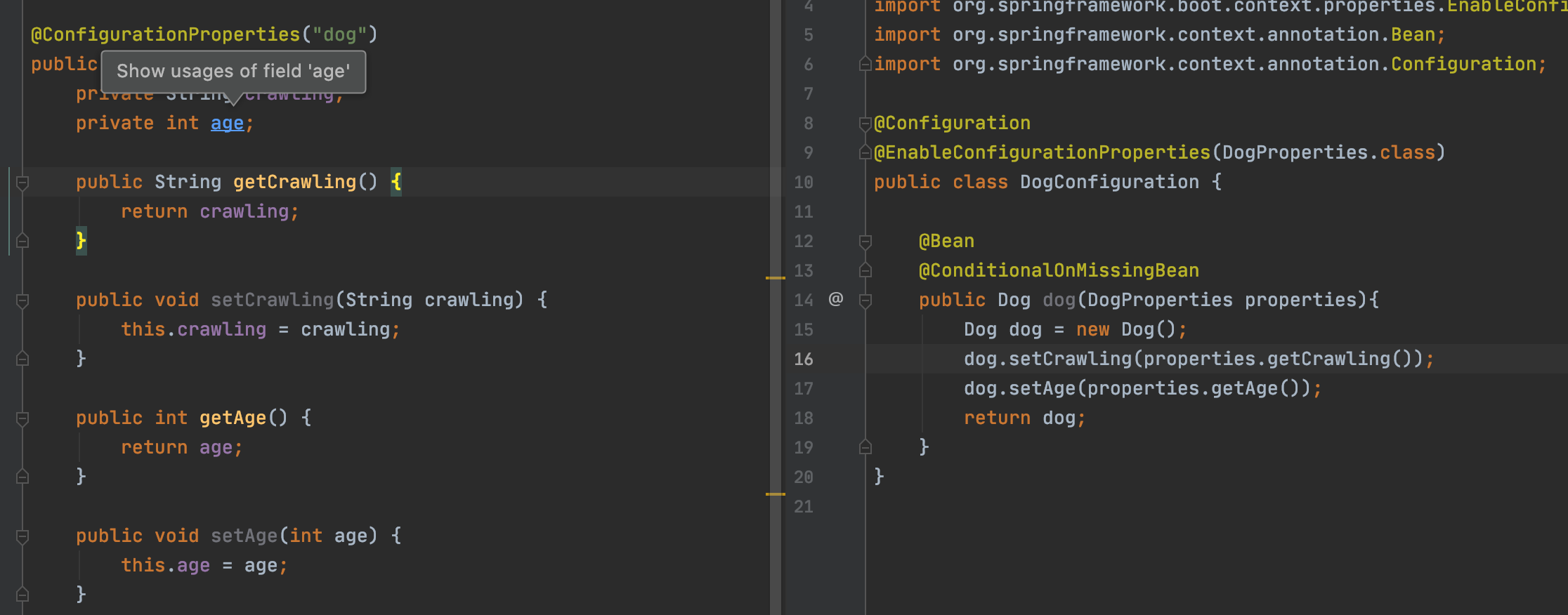 3)이 프로젝트를 사용하는 본 프로덕션 프로젝트의 application.properties에 dog.crawling , dog.age를 설정한다. (이때 dog는 1번에서 "dog"로 만들었기 때문에 이것을 사용한다.)