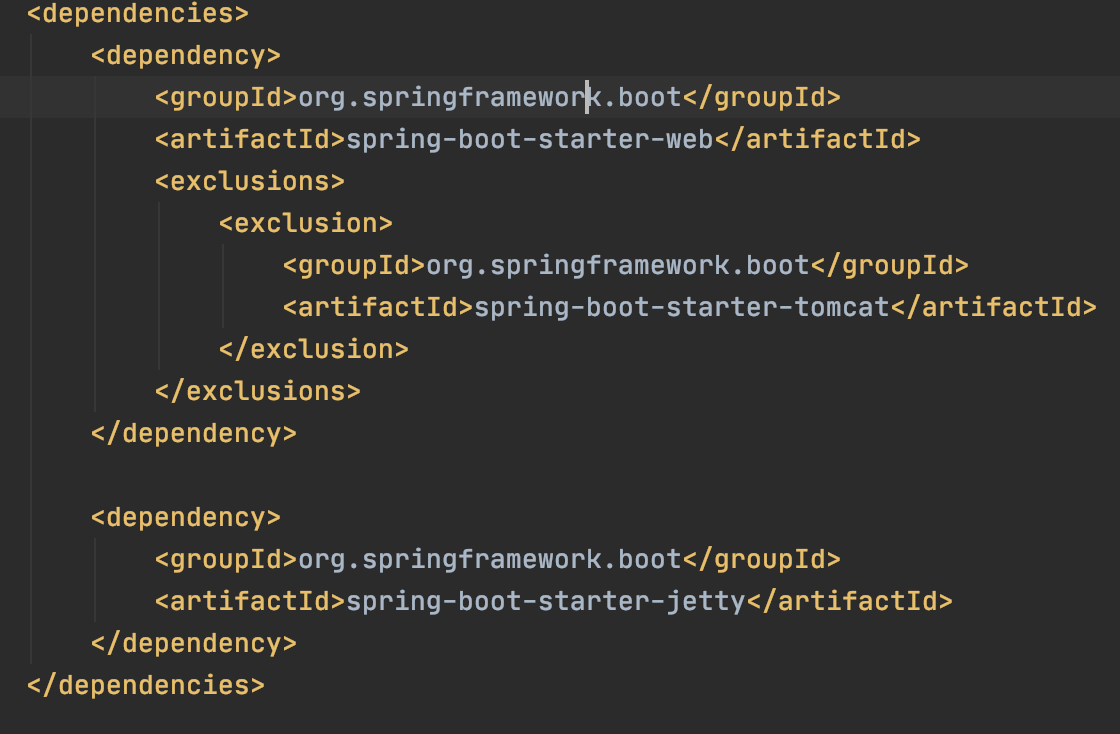 이것은 spring boot starter web이 다른 의존성들과 함께 가져오는 것이므로 <excliusions>태그를 이용하여 tomcat의존성은 가져오지 않도록 설정해준다.