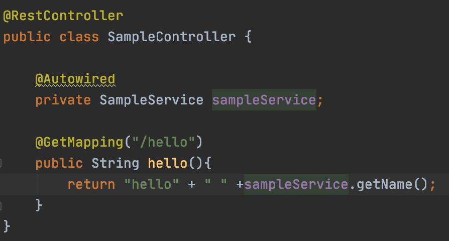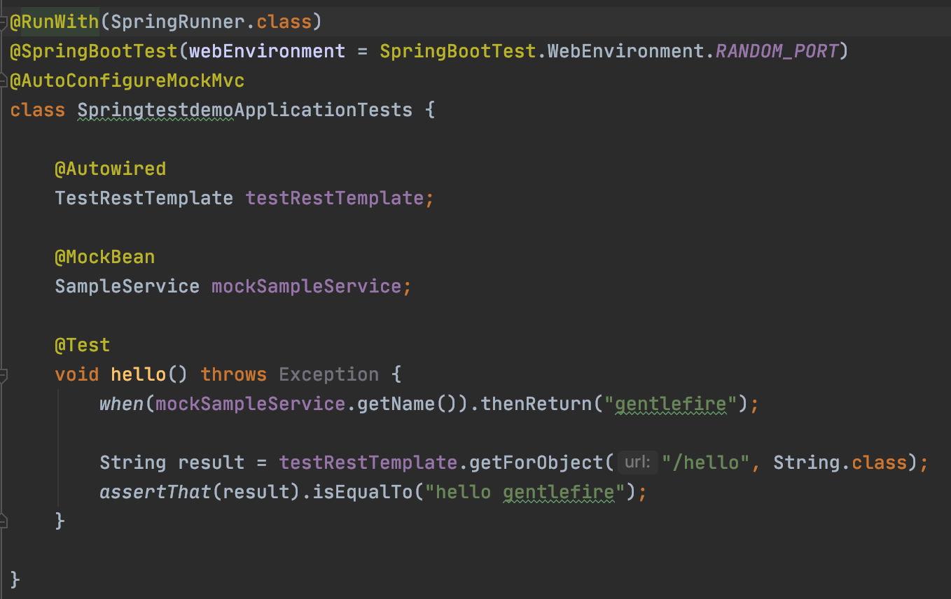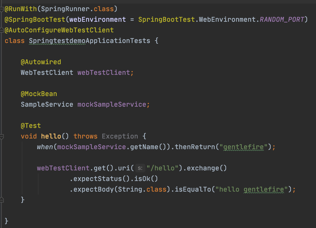 위와 같이 MockBean을 통해 SampleService를 주입받을때는 테스트에서만 사용할 mockSampleService로 주입받는다. 이후 when과 then을 통해 해당 메소드가 실행됬을때 기대되는 값을 직접 정해줌으로써 간편히 테스트 할 수 있다. (나의 경우에는 위와 같은 예시로는 필요성이 와닿지 않았었지만 랜덤값을 내놓는 로직에 대한 테스트를 작성할때 참 와닿았다.)