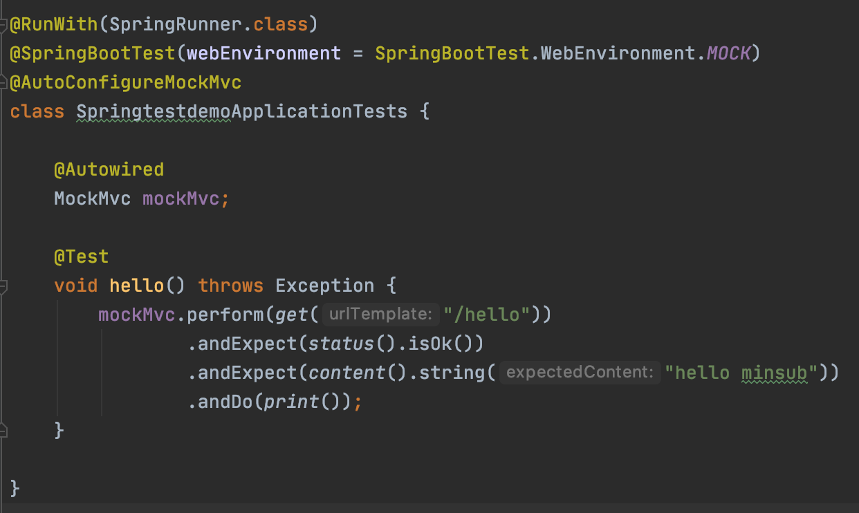 webEnvironment의 설정값이 MOCK일 경우 위의 테스트 코드를 보면 MockMvc를 주입받아 사용하는 것을 볼 수 있다. 이 객체를 이용하여 컨트롤러를 테스트할 수 있는데, 사용되는 메소드 등은 따로 공부를 해야겠다 ...