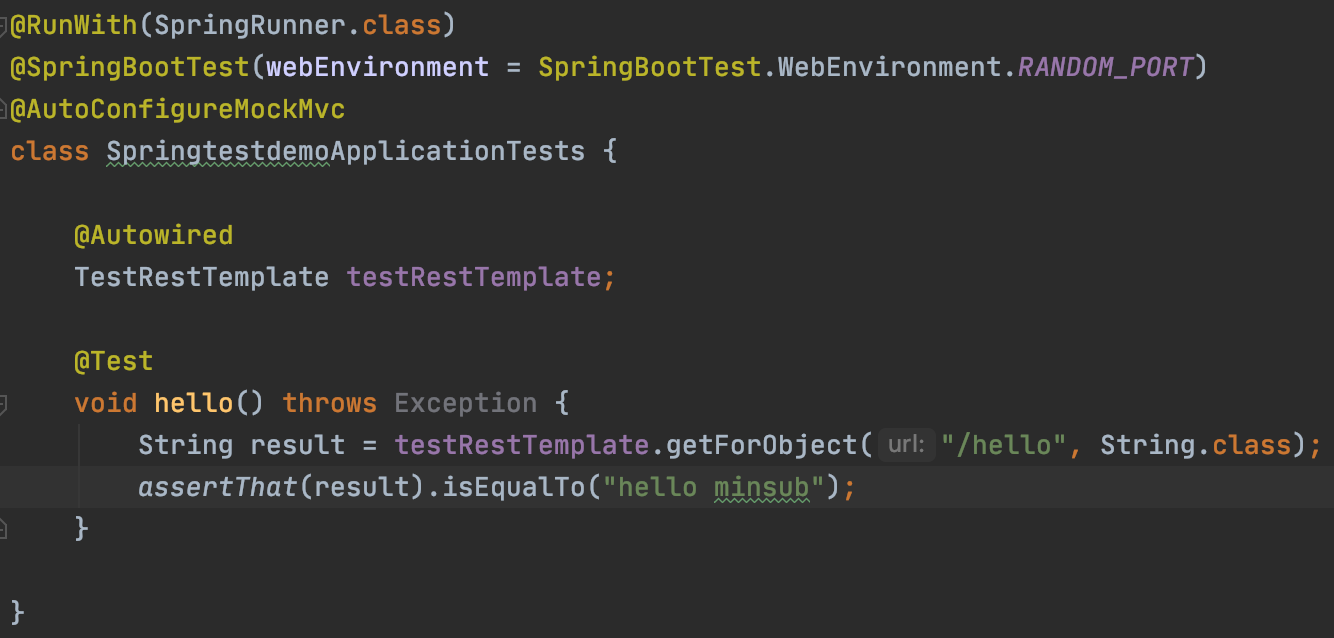 webEnvironment의 설정값이 RANDOM_PORT일경우 MockMvc객체가 아닌 TestRestTemplate객체를 사용하여 위와 같이 테스트 할 수 있다.